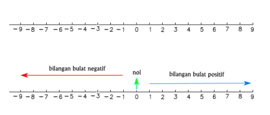 Berdasarkan garis bilangan di atas, yang termasuk bil. bulat negatif, yaitu semua bil. bulat di sebelah kiri nol (ditunjuk panah warna merah). Semakin ke kiri, nilai bilangannya semakin kecil. Sementara itu, yang termasuk bil. bulat positif, yaitu semua bil. bulat di sebelah kanan nol (ditunjuk panah warna biru). Semakin ke kanan, nilai bilangannya semakin besar.